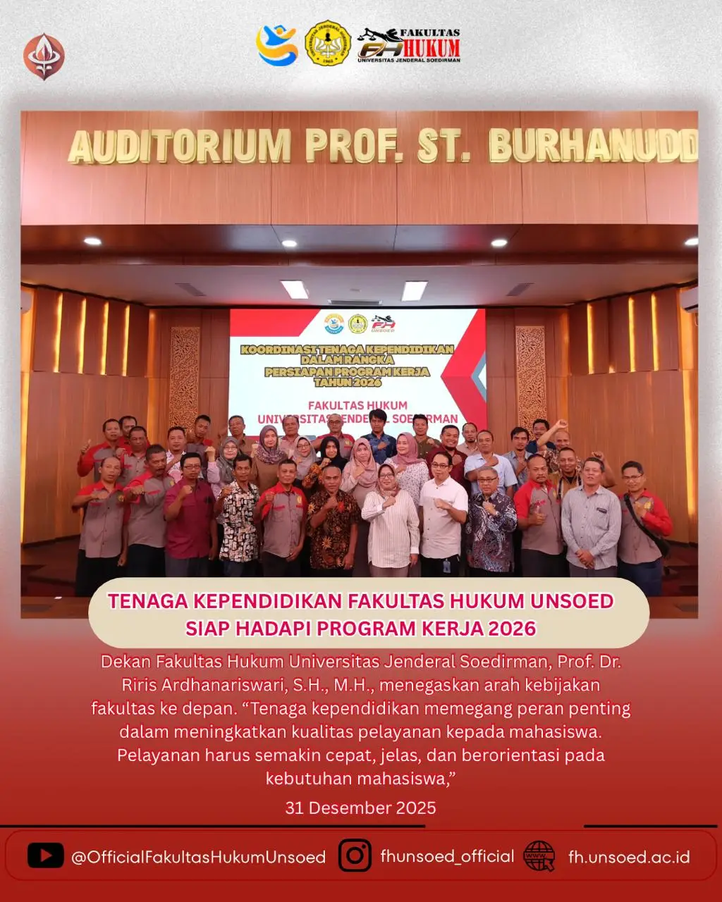Fakultas Hukum Universitas Jenderal Soedirman menyelenggarakan kegiatan Koordinasi Tenaga Kependidikan Dalam Rangka Persiapan Program Kerja Tahun 2026. Kegiatan ini menjadi […]