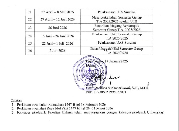 Kalender Akademik Fakultas Hukum Universitas Jenderal Soedirman Semester Genap Tahun Akademik 2025/2026