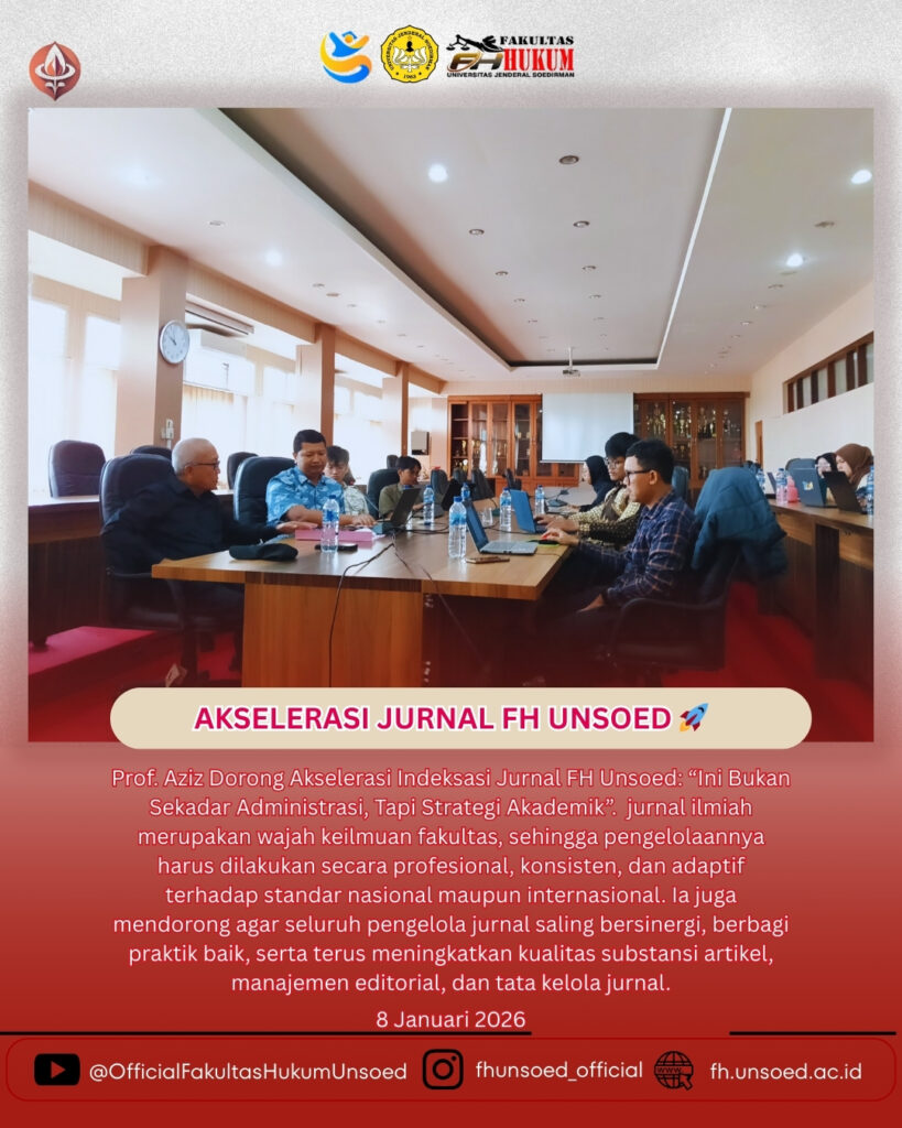 “Langkah percepatan indeksasi jurnal ini bukan sekadar soal pemenuhan administratif, tetapi merupakan strategi akademik yang sistemik untuk meningkatkan mutu, reputasi, dan daya saing keilmuan Fakultas Hukum Unsoed,” kata Prof. Dr. Abdul Aziz Nasihuddin, S.H., MM., MH., Ketua Law Journal Center FH Unsoed.