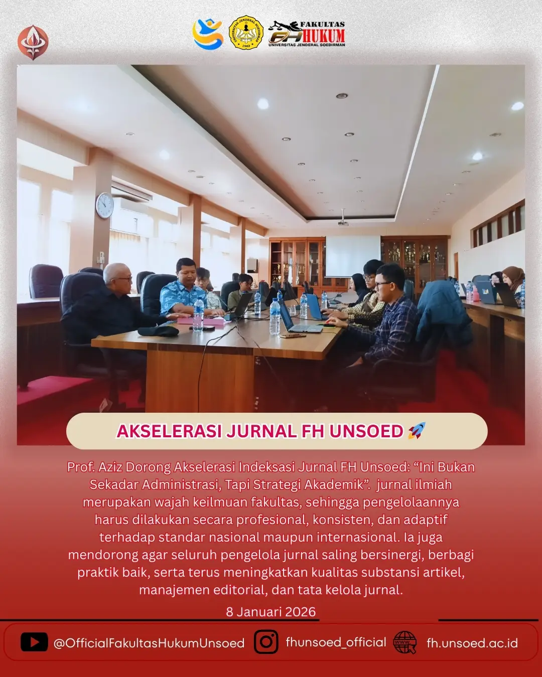 Melalui rapat koordinasi ini, FH Unsoed menegaskan komitmennya untuk terus mendorong penguatan publikasi ilmiah sebagai bagian dari pengembangan tridharma perguruan tinggi dan kontribusi fakultas dalam pengembangan ilmu hukum di Indonesia. (Aut: LabTekIn)
